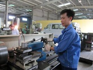 Hình 5: Đứng máy tiện, không được mang bao tay. Tiềm ẩn nguy hiểm: sợi vải tưa của bao tay dính vào mâm tay bị quấn vào mâm cặp.